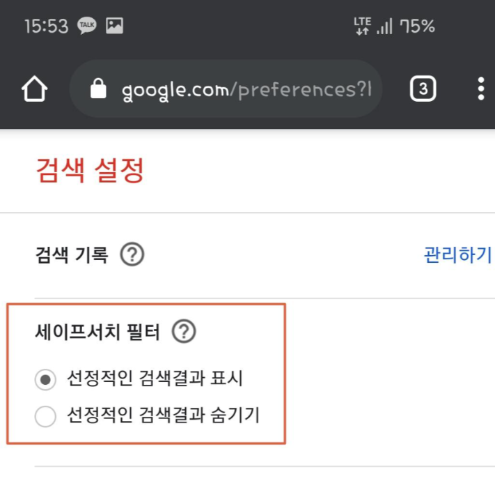 설정으로 들어가면 모바일에서도 가장 상단에 세이프서치 설정이 있는 것을 확인 할 수 있는데요, 이것을 검색결과 표시롤 해놓고 저장해놓으면 세이프서치가 정상적으로 해제 된 것입니다.