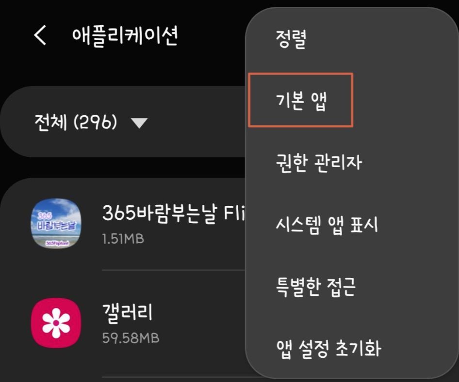 처음엔 동일하게 설정에 들어가서 이번엔 애플리케이션으로 들어갑니다. 우측 상단에 새로로 점 3개로 되어있는 메뉴를 클릭하고나서기본 앱을 눌러줍니다.