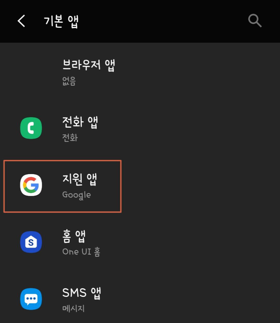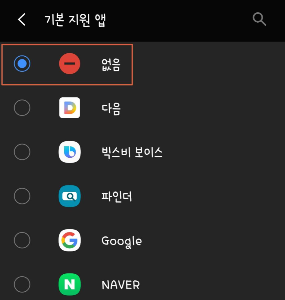 이렇게 들어가면 여러가지 앱 중에서 지원 앱이 구글로 설정되어 있는데요, 이 것을 없음으로 체크해주시면 완전히 구글 어시스턴트 끄기가 된 것입니다.