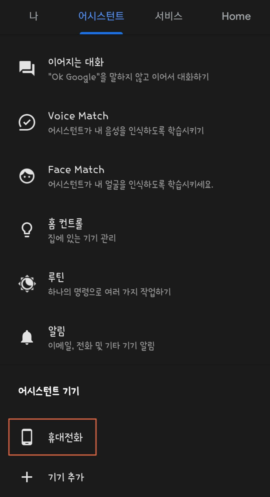 그런 뒤 맨 아래로 가면 어시스턴트 기기에 휴대전화가 있는데요, 이 휴대전화로 들어가면 구글 어시스턴트를 끄거나 켤 수 있는 탭이 있습니다. 본인이 구글 어시스턴트를 사용하지 않고 싶으면 이 설정으로 구글 어시스턴트를 끄면 됩니다.