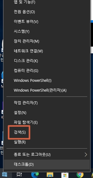먼저 오류를 해결하려면 윈도우에서 검색창을 띄워야하는데요, 윈도우 아이콘에 우클릭을 해서 검색창을 띄우거나 윈도우+s를 누르면 바로 검색을 할 수 있습니다.
