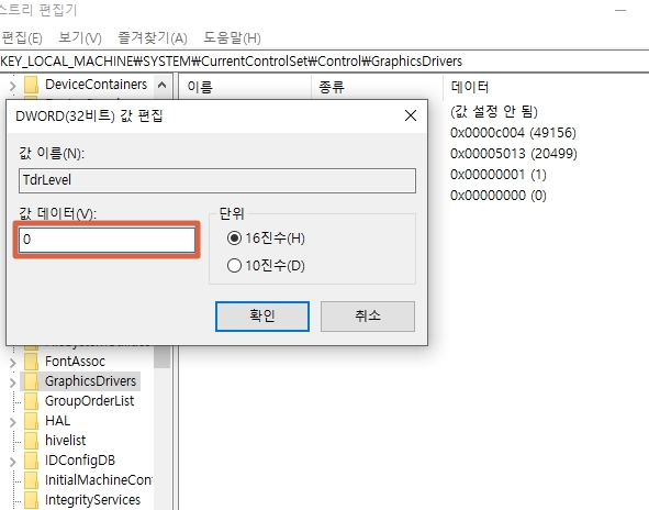 정상적으로 입력을 한 뒤에 생성된 파일을 우클릭하면 수정을 할 수 있는데, 수정으로 들어가서 해당 파일의 값 데이터가 0과 단위가 16진수로 되어있는지 반드시 확인해야 합니다.