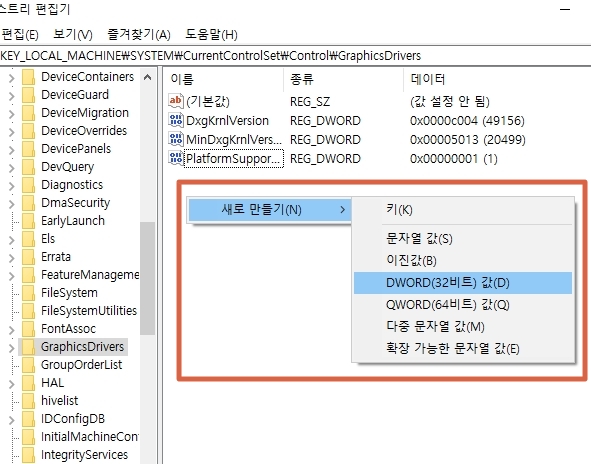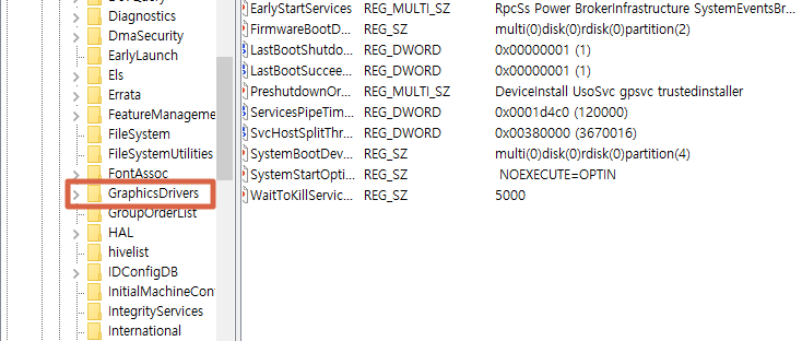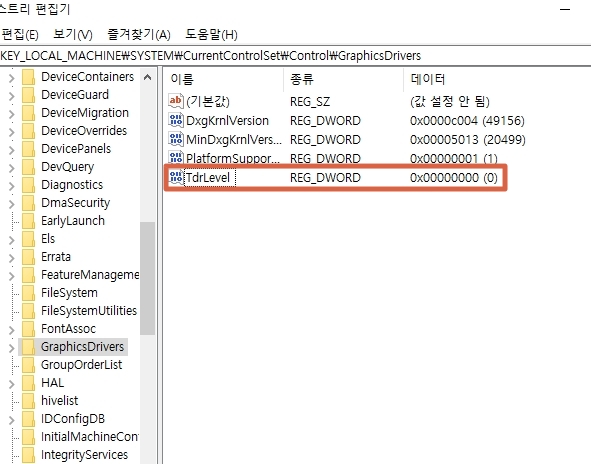 실행하게되면 이것저것 폴더가 굉장히 많이 뜨는 것을 볼 수 있는데요, 이 중에서 HKEY_LOCAL_MACHINE > SYSTEM > CurrentControlSet > Control > GraphicsDruvers 경로 순서대로 들어가주면 됩니다.