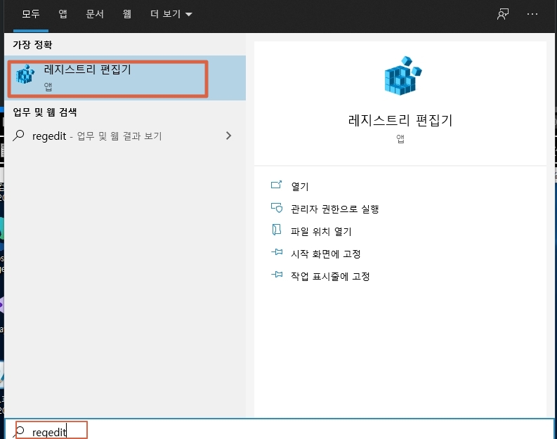 윈도우 검색창을 띄운 뒤에는 regedit 또는 레지스트리 편집기를 검색해주면 앱이 하나 뜨게 되는데 이 레지스트리 편집기를 실행시켜주면 됩니다.