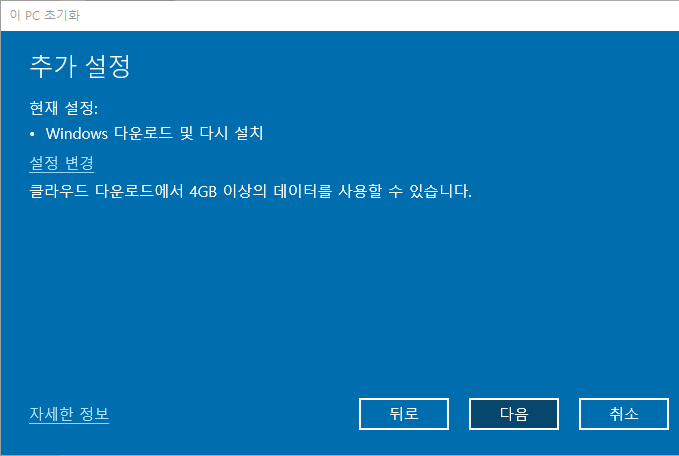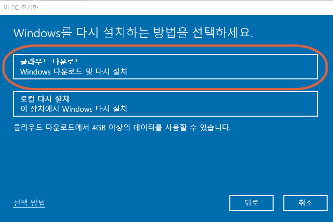 옵션을 선택하고 다음으로 넘어가면 윈도우10을 다시 설치하는 방법을 선택하게 되는데요, 클라우드 다운로드를 선택한 뒤 다음으로 넘어가 주시면 됩니다. 다음으로 넘어가서 마지막으로 백업은 제대로 다 했는지, 윈도우10 초기화 설정 옵션 등을 확인해주고 초기화를 실행해 주시면 자동으로 초기화와 윈도우10 재설정이 됩니다.
