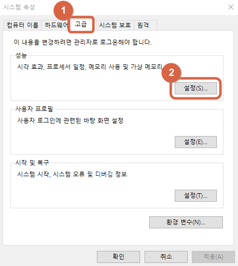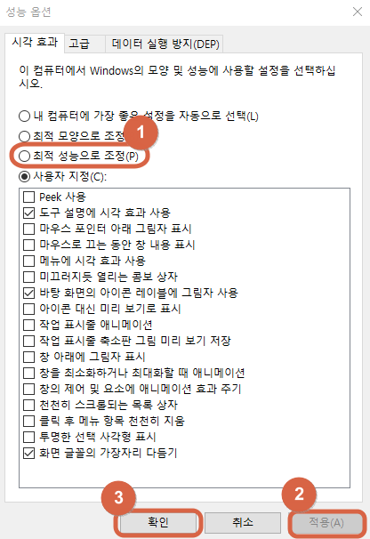 시스템에서 원격설정 - 고급 - 성능설정으로 들어오면 최적 성능으로 조정이 있는데요, 이것을 클릭한 뒤 적용을 해주면 윈도우10 최적화가 어느정도는 됐다고 볼 수 있습니다.