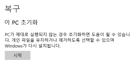 이 중 윈도우10 초기화는 복구 탭에서 할 수 있습니다. 복구에 들어가면 가장 상단에 있는 이 PC 초기화를 선택할 수 있는데요, 클릭해줍니다.