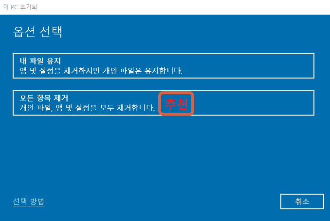 두 번째로 모든 항목 제거 옵션은 윈도우10 초기화를 할 때 앱이나 설정 뿐아니라 개인적으로 가지고 있는 사진이나 파일 등을 전부 삭제하는 방법입니다. 윈도우10 초기화를 하려면 두 번째 방법을 좀 더 추천드립니다.