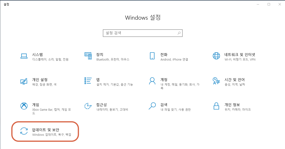 설정에 들어가면 하단에 업데이트 및 보안이라는 탭이 보이는데요 윈도우10 초기화를 하기 위해서 해당 탭으로 이동해줍니다. 업데이트 및 보안에서는 윈도우10 초기화 뿐 아니라 윈도우10을 사용하면서 업데이트나 백업 등 여러가지 기능들을 사용 할 수 있습니다.