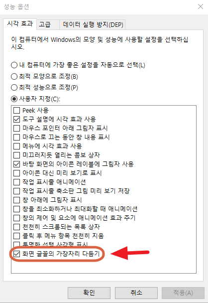 다만 이런 경우 폴더 글씨나 파일의 글씨가 조금 깨져보이는 현상이 있을 수 있는데요, 이것이 불편하다고 느껴지시는 분은 사용자 지정에서 가장 마지막에 있는 것만 체크해주시면 이런 현상이 없어지기 때문에 필요에 맞게 사용하시기 바랍니다.