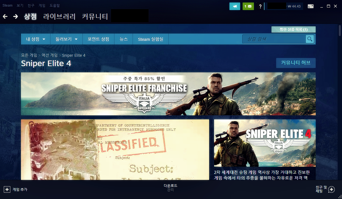 스나이퍼 엘리트4는 현재 스팀에서 주중할인을 하고 있는데요, 10월 23일까지 85% 할인 된 가격으로 만원이 넘지 않는 가격에 게임을 구매 할 수 있습니다.