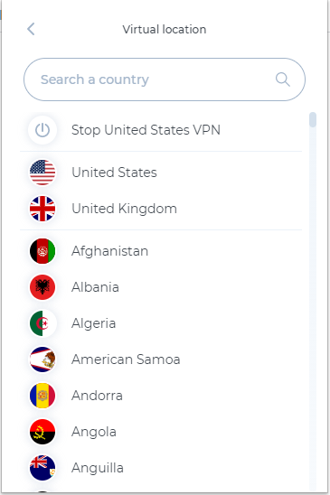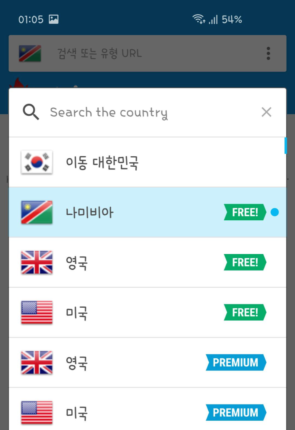 어플 검색 부분에 있는 국기를 선택하면 컴퓨터에서 사용하던 것과 같이 자신이 원하는 국가를 선택해 vpn 우회를 한 뒤 크롬으로 접속을 하면 vpn 우회를 할 수 있습니다.