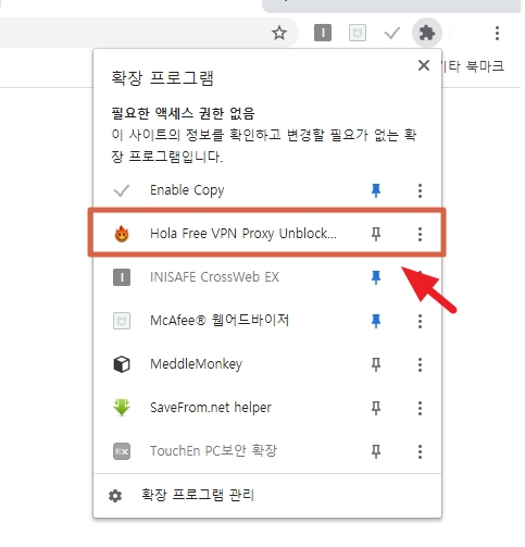 이렇게 vpn 우회 확장프로그램을 설치 완료 했다면 거의 반 이상 vpn 우회를 완료 한 것인데요, 크롬 브라우저 우측 상단에 있는 퍼즐 모양으로 생긴 아이콘을 클릭한 뒤 vpn 프로그램을 실행해주세요.