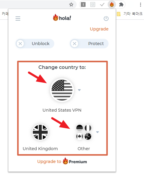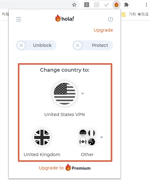 처음 vpn을 실행하면 여러가지 국기 아이콘이 흑백으로 되어있을 것인데요, 이 상태는 아직 vpn이 실행되지 않고 있는 상태입니다. 그 상태에서 화면에 보이는 미국 국기 모양 아이콘이나 other 아이콘을 클릭해 본인이 원하는 국가를 선택해서 vpn을 실행해주면 vpn 우회가 완료되는 것입니다.