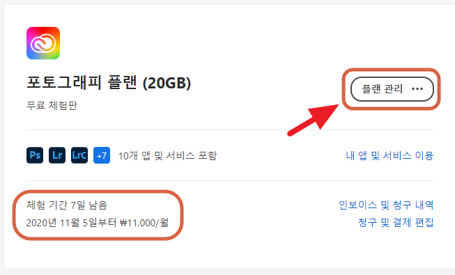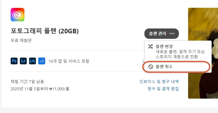 여기에서 플랜관리로 들어가 플랜취소를 하면 정상적으로 어도비 포토샵 플랜을 취소할 수 있습니다.