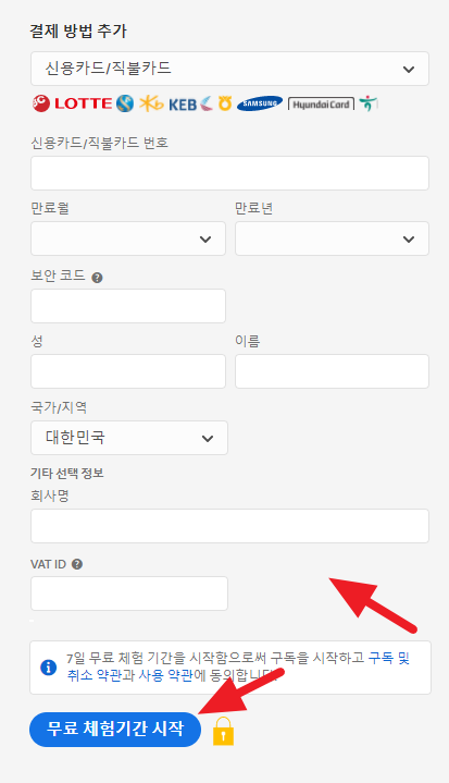 가입을 완료하면 어도비 포토샵 무료 체험판을 다운로드 하기 위해 간단한 신용카드, 체크카드 정보등을 입력해야 하는데요, 여기에 정보를 입력한다고 해서 바로 결제가 되는 것이 아니기 때문에 걱정하지 않으셔도 됩니다.