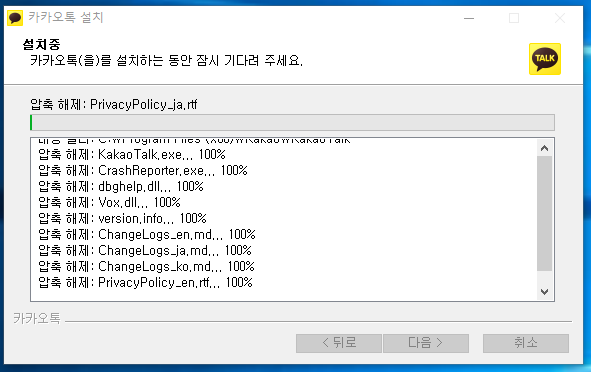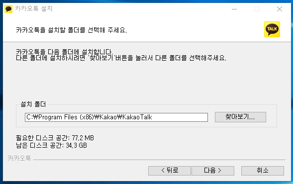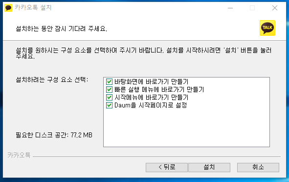 카카오톡 pc 버전 설치 파일을 다운로드 완료 했다면 이제 설치 파일을 실행한 뒤 카카오톡 pc 버전 설치를 진행해주시면 되는데요, 설정을 몇 가지 선택한 뒤 다음으로 넘어가주면 카카오톡 pc 버전 설치가 진행이 됩니다.