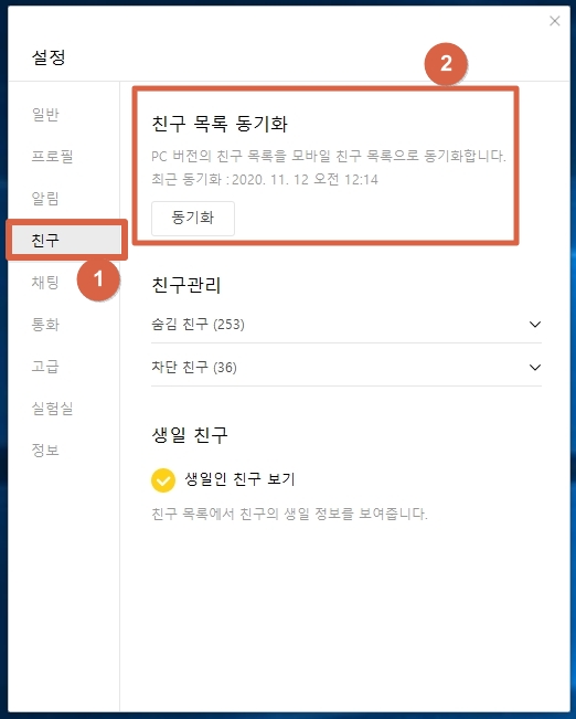 만일 카카오톡 pc 버전에서 친구 목록이 확인이 되지 않는다면 카카오톡 pc 버전 설정에서 친구 탭에 들어가면 친구 목록 동기화를 할 수 있습니다.
