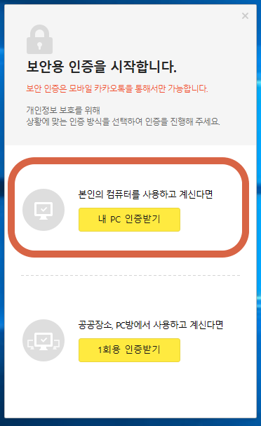 카카오톡 pc 버전 설치가 완료되었다면 본인이 모바일에서 사용하고 있던 카카오톡 계정으로 로그인을 해준뒤 내 pc 인증받기를 눌러준 뒤 보안코드 입력창이 뜨는 것을 확인 할 수 있습니다.