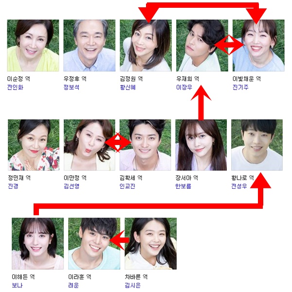 오 삼광빌라 등장인물에는 이밖에도 이만정 역의 김선영, 김확세 역의 인교진, 황나로 역의 전성우, 이해든 역의 보나, 이라훈 역의 려운, 차바른 역의 김시은이 등장하며 이들도 오 삼광빌라의 재미를 가져다준다. 이 모든 등장인물들의 인물관계도는 대략 아래와 같다.
