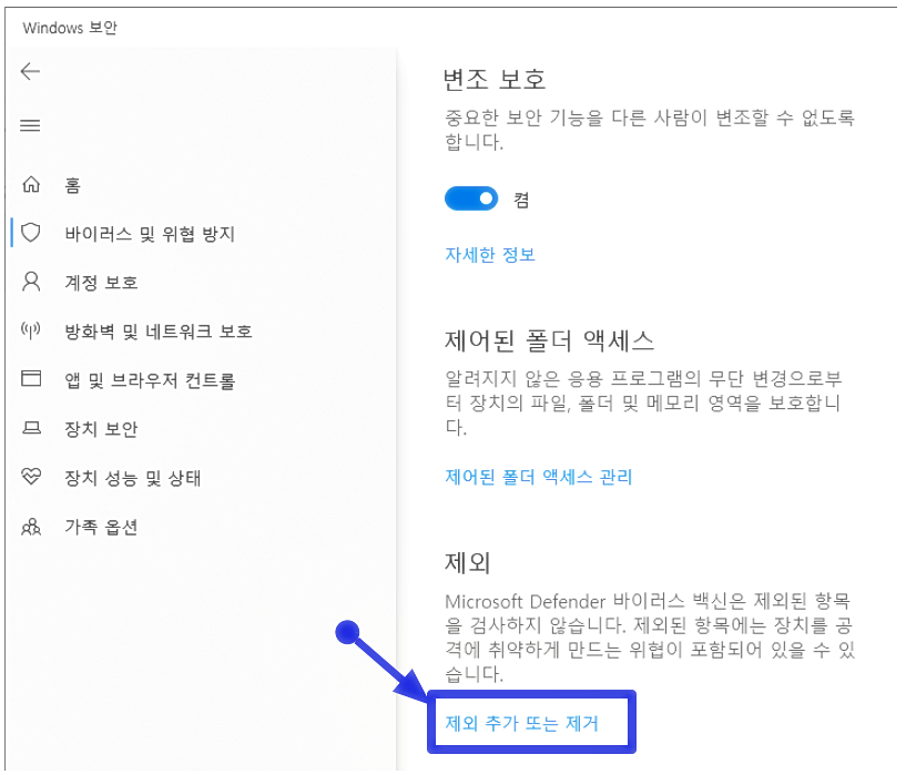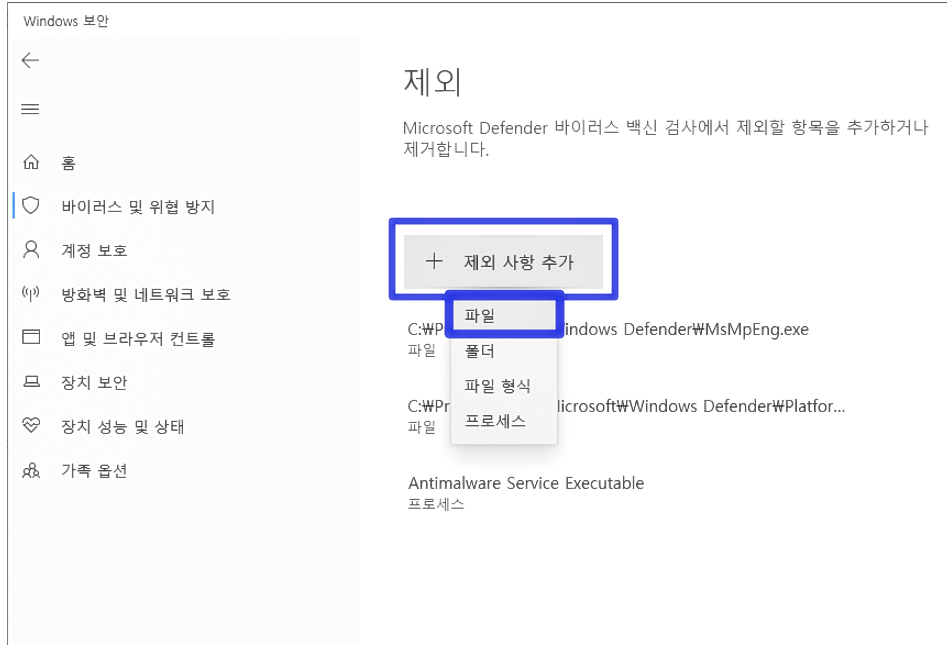 윈도우 10에 기본프로그램이기 때문에 방법으로는 윈도우 디펜더가 더이상 Antimalware service executable을 감시하지 않도록 예외처리하는 것이 가장 쉬운 방법입니다. 아래에서 Antimalware service executable 예외처리하는 방법과 주의사항에 대해서 설명하겠습니다.