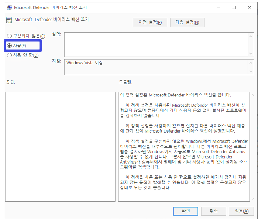 그러면 이제 오른쪽에 마이크로소프트 디펜더 바이러스 백신 상세페이지가 나오게 됩니다. 그러면 그 항목중에서 마이크로소프트 디펜더 백신 끄기를 선택하시게 되면 정책설정 편집 버튼이 나오게 됩니다. 여기서 이제 백신 끄기 사용으로 변경하시고 확인을 눌러주세요.