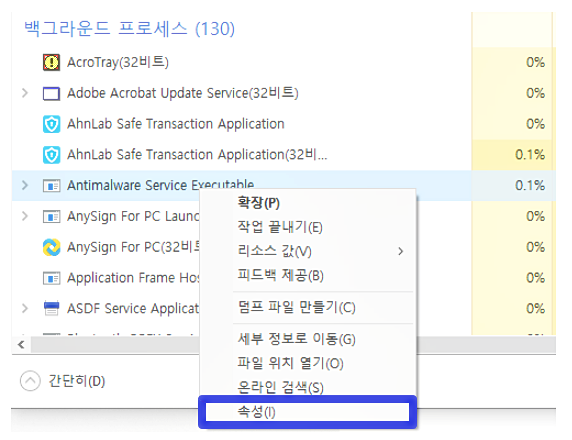 먼저 주의사항부터 알려드릴게요. 예외처리를 하기 전 먼저 Antimalware service executable 프로세스가 어느 위치에서 실행되고 있는지를 알아야 합니다. 위치를 알아야만 예외처리를 하려 메모리 점유율을 낮출 수 있기 때문입니다.