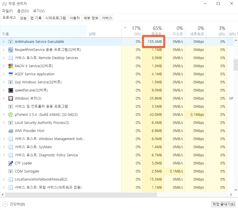 Antimalware Service Executable 메모리 점유율 낮추는 방법