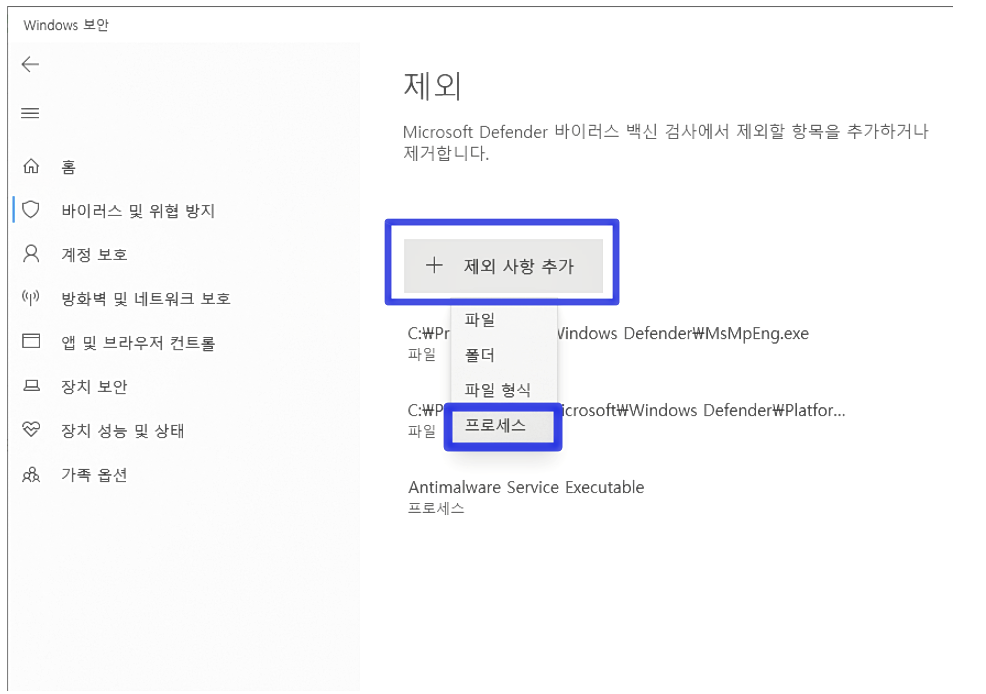 끝으로 프로세스명으로 예외를 추가해주셔야 합니다. 프로세스 입력란에 'Antimalware service executable'을 입력하고 추가해주시면 됩니다. 이 후 컴퓨터를 재시작하여 정상적으로 반영되었는지를 확인해 주시면 됩니다.