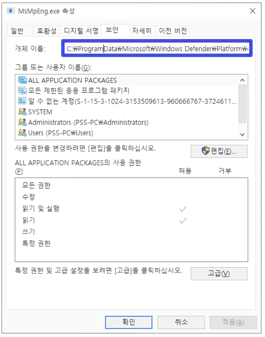 그럼 작업관리자에서 Antimalware service executable 프로세스를 선택하고 마우스 우클릭하여 나오는 메뉴창에서 속성창을 클릭해 주세요. 그러면 이제 실제 실행파일인 MsMpEng.exe인지 알게 되실 겁니다. 보안탭을 들어가신 후 개체이름에 있는 위치를 복사해서 메모장에 붙여주세요.