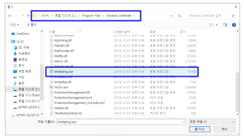 그 다음 밑으로 내리시면 제외 항목에서 '제외 추가 또는 제거'를 클릭해주세요. 그리고 '제외 사항 추가'를 클릭하셔서 파일을 선택해주세요. 선택해야 할 파일은 알고 계시죠? Antimalware service executable의 실제 파일인 MsMpEng.exe 파일이 있는 위치로 이동해주세요 위에서부터 천천히 읽고 실행하고 계셨다면 위치를 복사한 메모장이 있을겁니다. 보통 MsMpEng.exe가있는위치는C:ProgramFiles\WindowsDefender에있습니다.하지만 다른곳에 있을수도 있기 때문에 위에서 위치를 반드시 복붙해주셔야해요